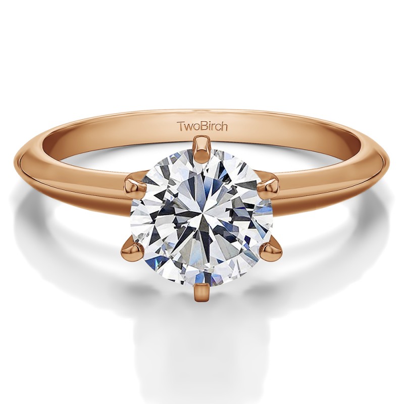 This solitaire engagement ring features a round center stone weighing 1.50 carats. The center stone is set with a traditional six prong setting. The center stone in this ring is moissanite with G to H color and VVS clarity. Since we do not keep center diamonds in stock, please allow 1 to 2 weeks for production of your engagement ring and procurement of the center diamond. The band measures approximately 2 millimeters and weighs about 3.2 grams.