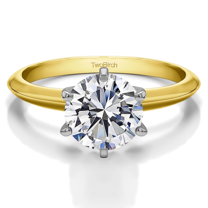 This solitaire engagement ring features a round center stone weighing 1.75 carats. The center stone is set with a traditional six prong setting. The center stone in this ring is moissanite with G to H color and VVS clarity. Since we do not keep center diamonds in stock, please allow 1 to 2 weeks for production of your engagement ring and procurement of the center diamond. The band measures approximately 2 millimeters and weighs about 3.2 grams.