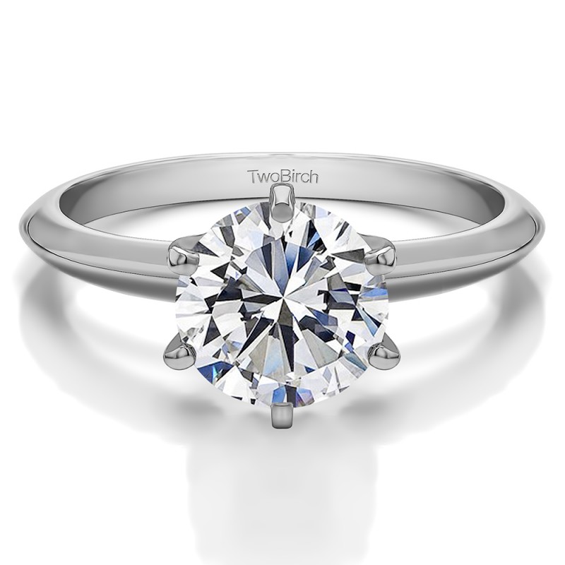 This solitaire engagement ring features a round center stone weighing 1.75 carats. The center stone is set with a traditional six prong setting. The center stone in this ring is moissanite with G to H color and VVS clarity. Since we do not keep center diamonds in stock, please allow 1 to 2 weeks for production of your engagement ring and procurement of the center diamond. The band measures approximately 2 millimeters and weighs about 3.2 grams.
