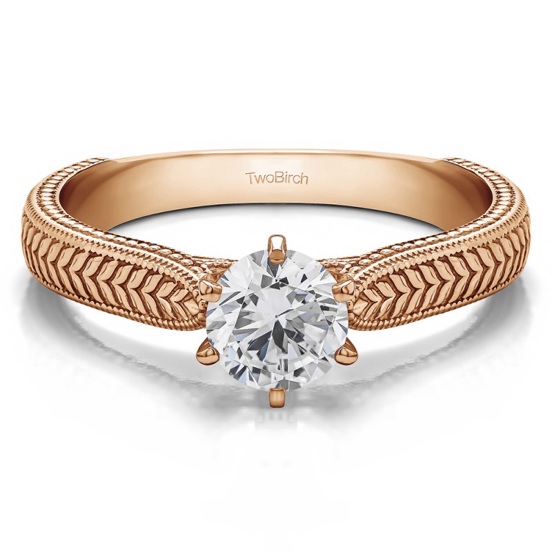 This solitaire engagement ring features a round center stone weighing 1 carat. The center stone is set with a traditional six prong setting. It features a raised profile and pinched band towards the center stone. Each center diamond you select will have the following minimum specifications: Good Cut, Symmetry, Proportions and No Fluorescence. Since we do not keep center diamonds in stock, please allow 1 to 2 weeks for production of your engagement ring and procurement of the center diamond. The band measures approximately 2 millimeters and weighs about 5.7 grams.