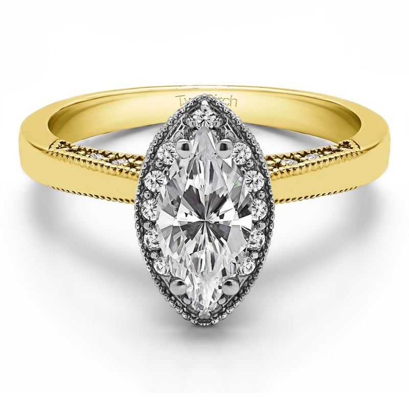 This engagement ring features a marquise center stone, surrounded by 40 round side stones. It has a 0.75 carat center stone, and 0.25 carats of side stones, giving the engagement ring a total weight of 1 carat. The band measures about 2 millimeters wide. All TwoBirch engagement rings are made with conflict free and eco-conscious metals and stones.