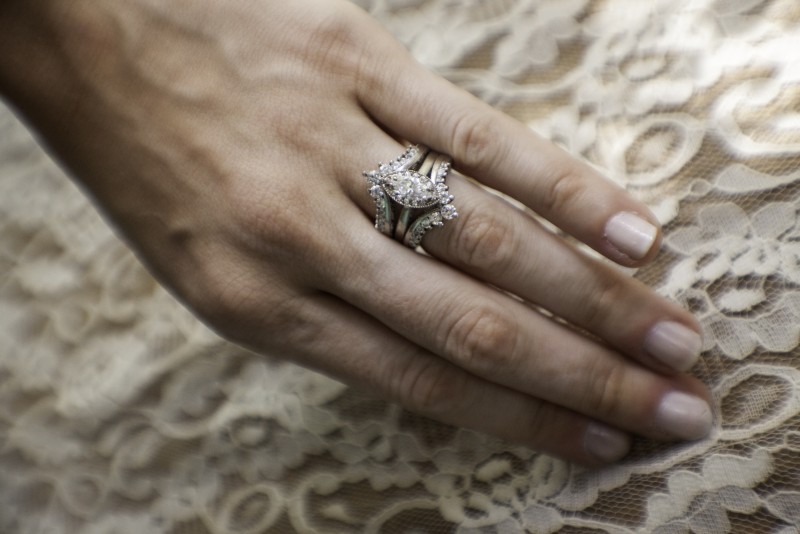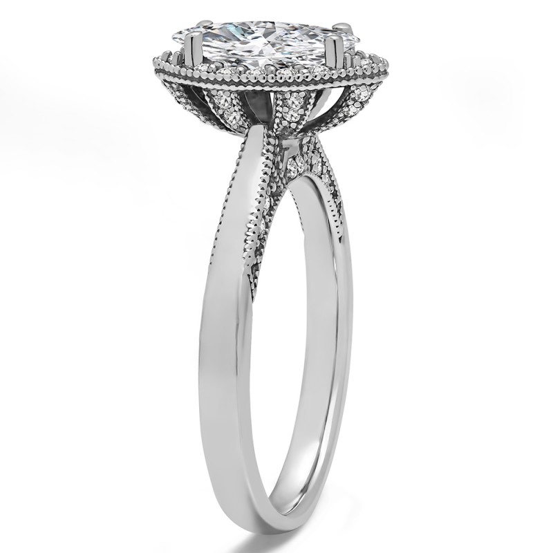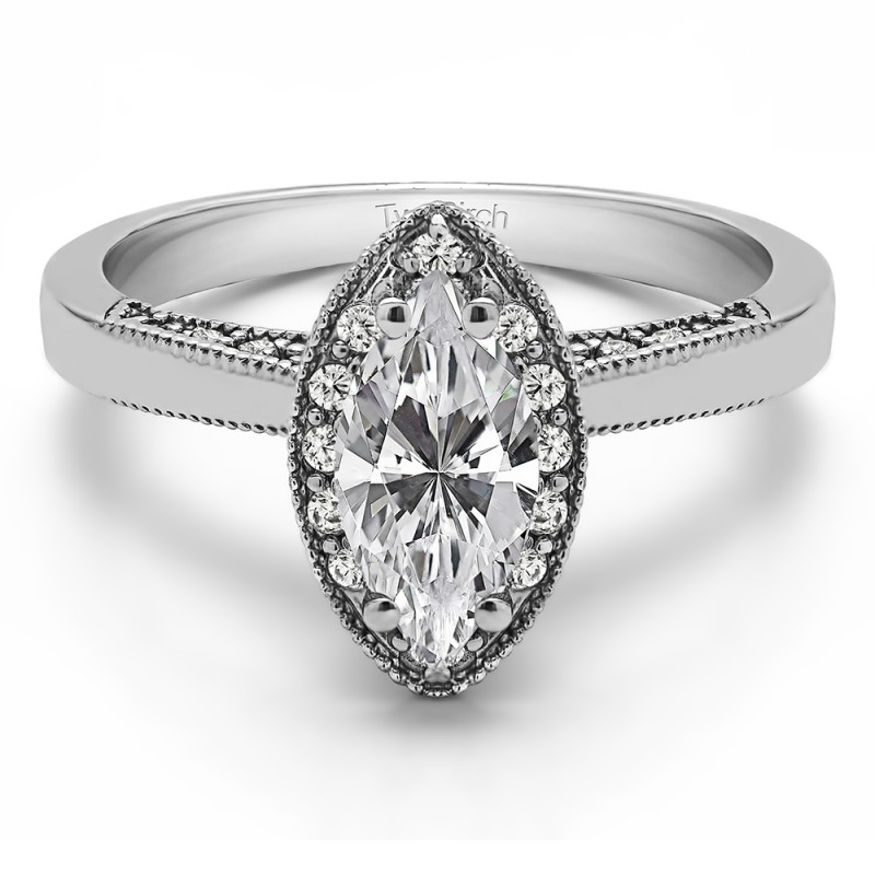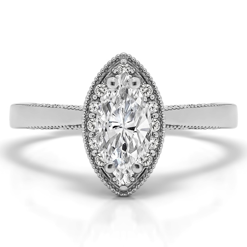 This engagement ring features a marquise center stone, surrounded by 40 round side stones. It has a 0.75 carat center stone, and 0.25 carats of side stones, giving the engagement ring a total weight of 1 carat. The band measures about 2 millimeters wide. All TwoBirch engagement rings are made with conflict free and eco-conscious metals and stones.