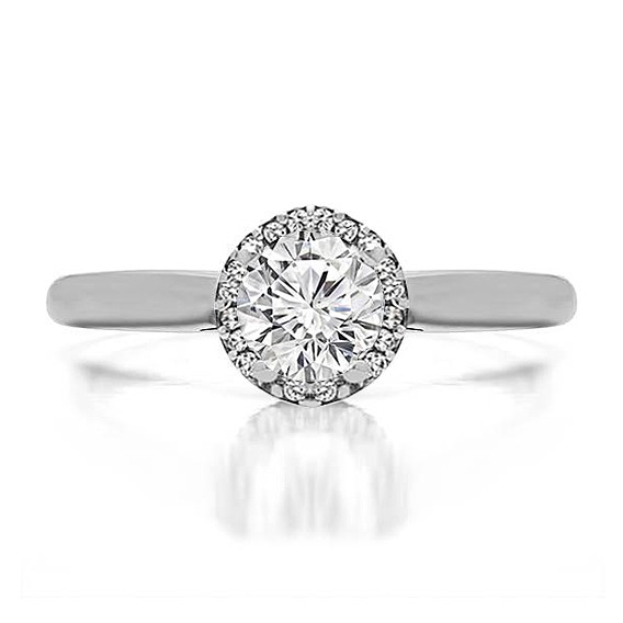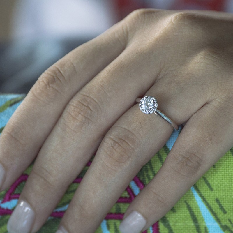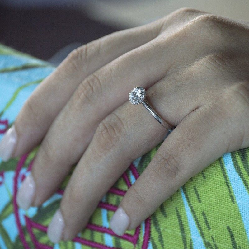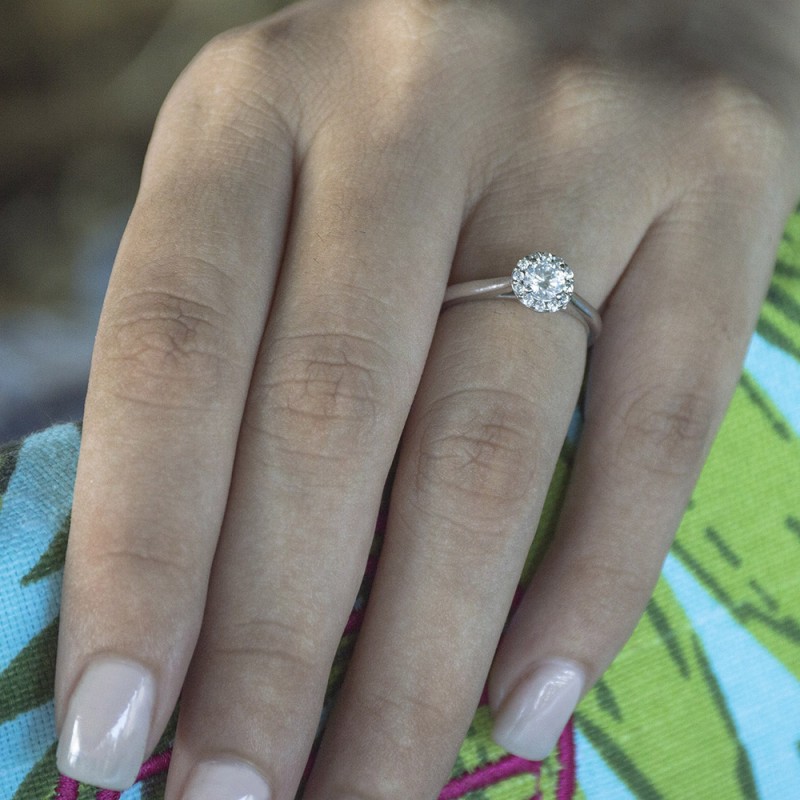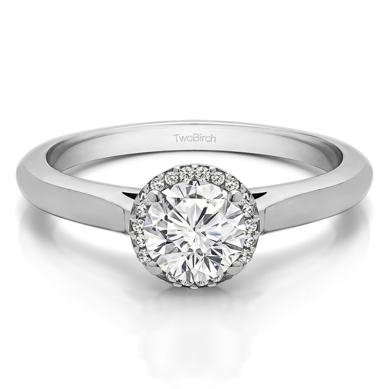 This engagement ring features a round center stone, surrounded by 20 round side stones. It has a 0.9 carat center stone, and 0.1 carats of side stones, giving the engagement ring a total weight of 1 carat. The band measures about 2 millimeters wide. All TwoBirch engagement rings are made with conflict free and eco-conscious metals and stones.