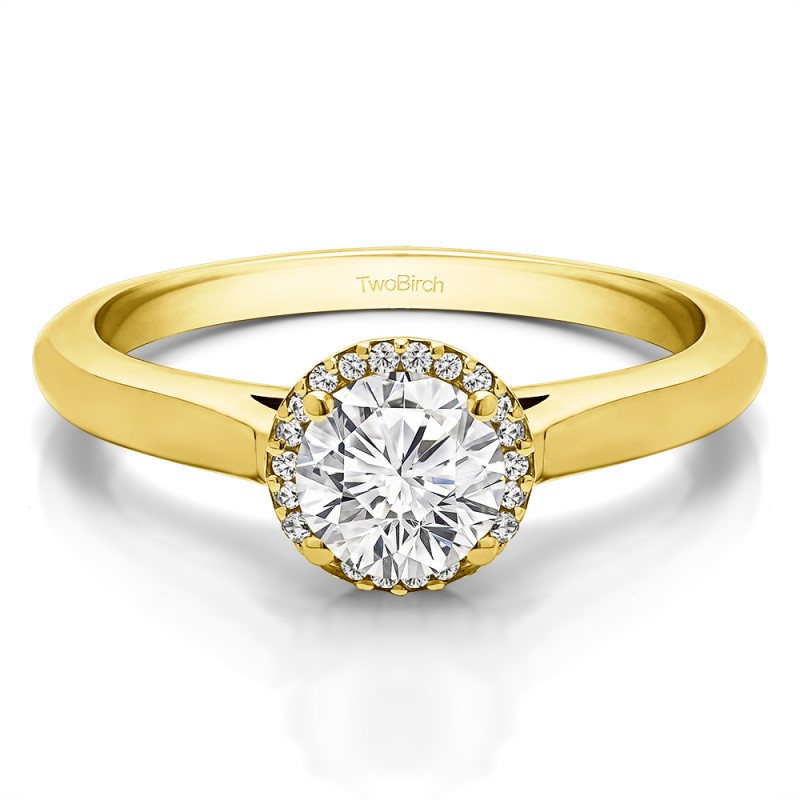 This engagement ring features a round center stone, surrounded by 20 round side stones. It has a 0.9 carat center stone, and 0.1 carats of side stones, giving the engagement ring a total weight of 1 carat. The band measures about 2 millimeters wide. All TwoBirch engagement rings are made with conflict free and eco-conscious metals and stones.