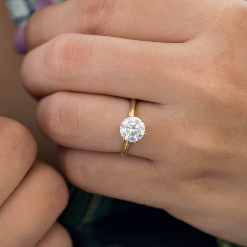 This solitaire engagement ring features a round center stone weighing 1 carat. The center stone is set with a traditional six prong setting. Each center diamond you select will have the following minimum specifications: Good Cut, Symmetry, Proportions and No Fluorescence. Since we do not keep center diamonds in stock, please allow 1 to 2 weeks for production of your engagement ring and procurement of the center diamond. The band measures approximately 2 millimeters and weighs about 3.2 grams.