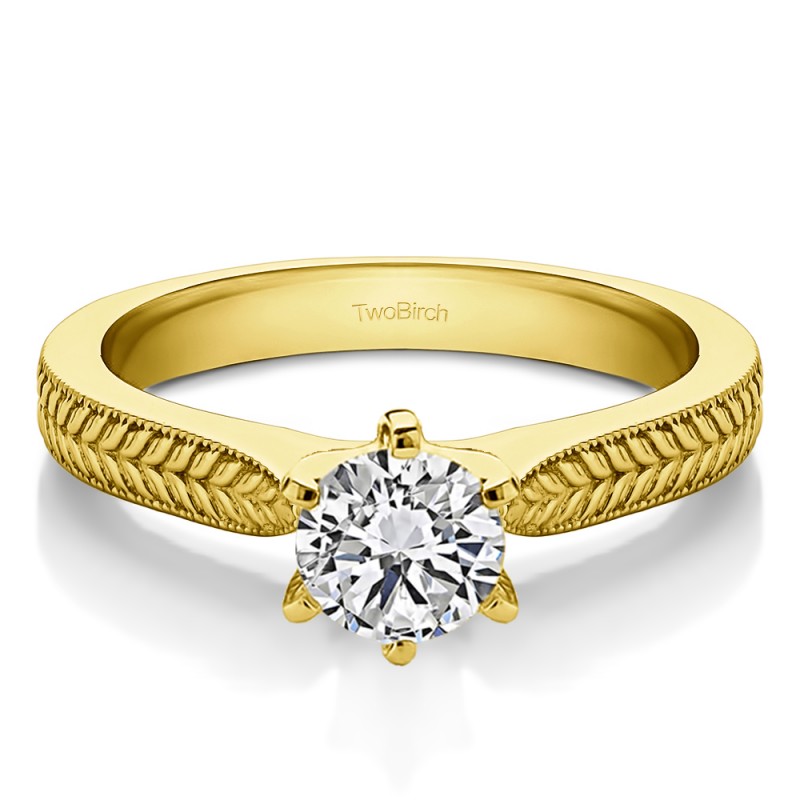 This solitaire engagement ring features a round center stone weighing 1 carat. The center stone is set with a traditional six prong setting. It features a raised profile and a thin pinched band towards the center stone. Each center diamond you select will have the following minimum specifications: Good Cut, Symmetry, Proportions and No Fluorescence. Since we do not keep center diamonds in stock, please allow 1 to 2 weeks for production of your engagement ring and procurement of the center diamond. The band measures approximately 2 millimeters and weighs about 5.6 grams.