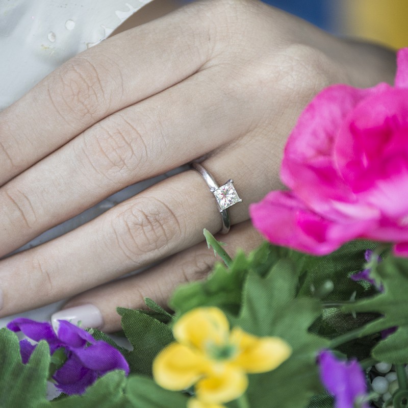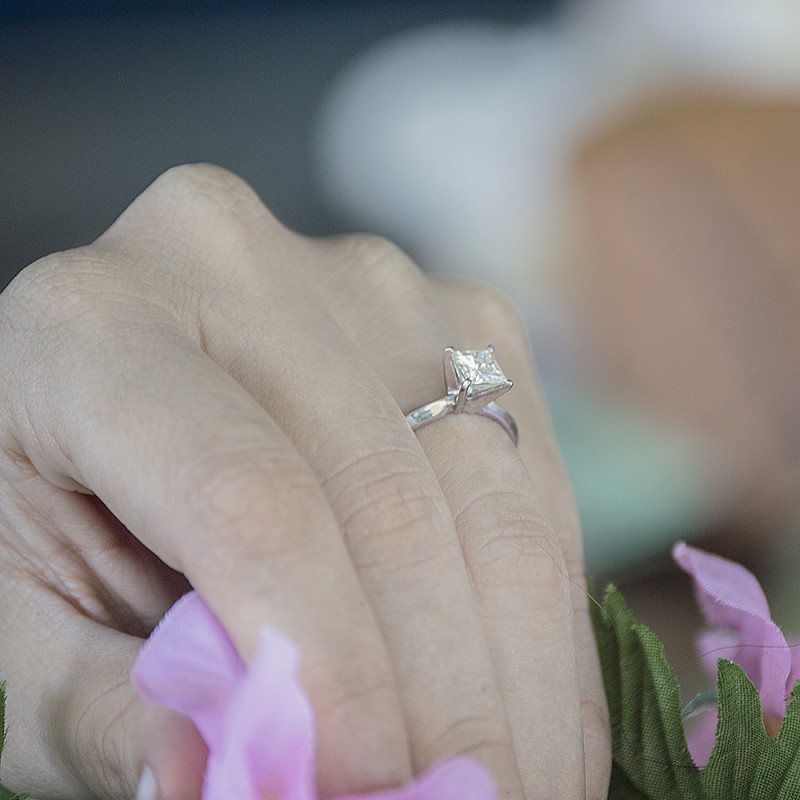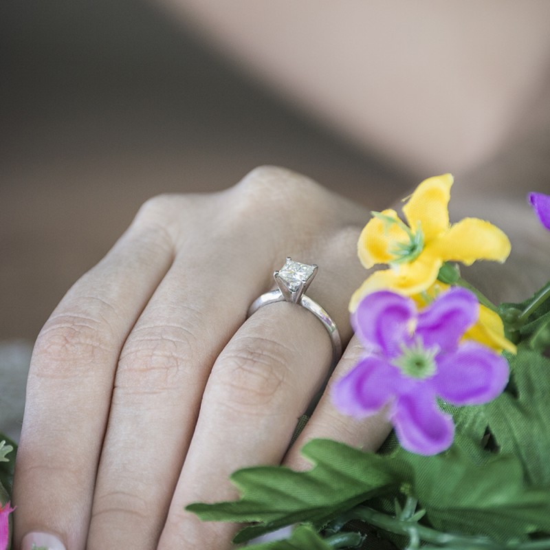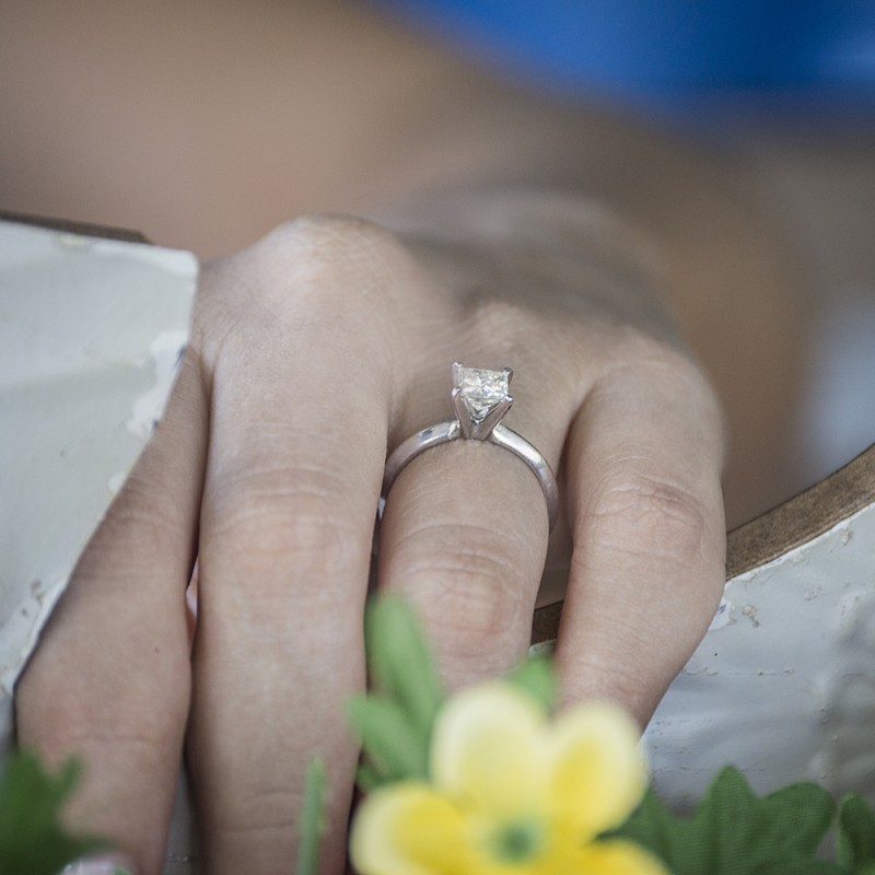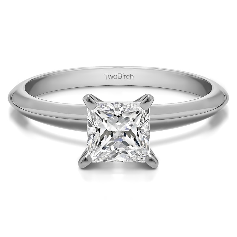 This solitaire engagement ring features a princess cut center stone weighing 1 carat. The center stone is set with a four prong setting. Each center diamond you select will have the following minimum specifications: Good Cut, Symmetry, Proportions and No Fluorescence. Since we do not keep center diamonds in stock, please allow 1 to 2 weeks for production of your engagement ring and procurement of the center diamond. The band measures approximately 2 millimeters and weighs about 3.15 grams.