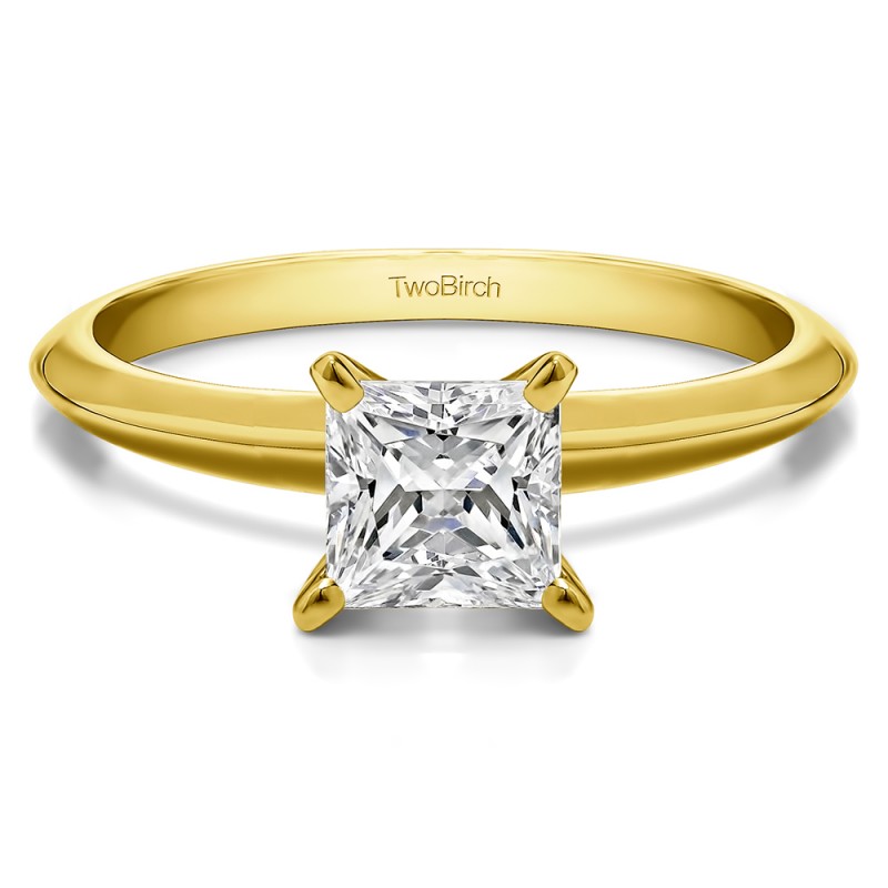 This solitaire engagement ring features a princess cut center stone weighing 1 carat. The center stone is set with a four prong setting. Each center diamond you select will have the following minimum specifications: Good Cut, Symmetry, Proportions and No Fluorescence. Since we do not keep center diamonds in stock, please allow 1 to 2 weeks for production of your engagement ring and procurement of the center diamond. The band measures approximately 2 millimeters and weighs about 3.15 grams.