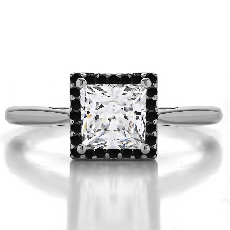 This engagement ring features a princess cut center moissanite stone, surrounded by 20 round black diamond side stones. It has a 0.9 carat center stone, and 0.1 carats of side stones, giving the engagement ring a total weight of 1 carat. The band measures about 2 millimeters wide. All stones in this engagement ring are brilliant moissanite with G to H color and VVS clarity. All TwoBirch engagement rings are made with conflict free and eco-conscious metals and stones.