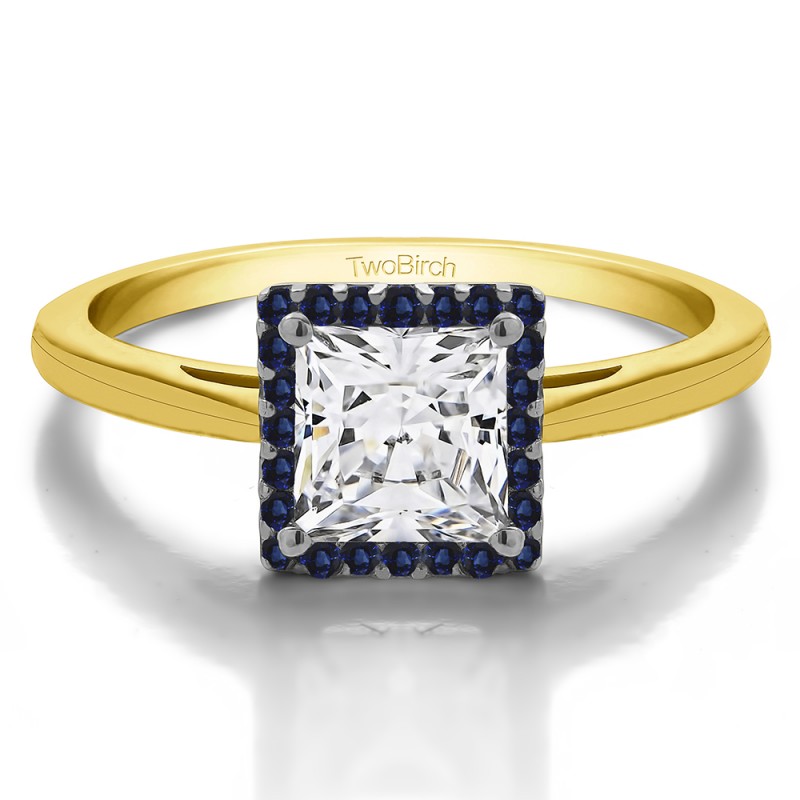 This engagement ring features a princess cut center moissanite, surrounded by 20 round sapphire side stones. It has a 0.9 carat center stone, and 0.1 carats of side stones, giving the engagement ring a total weight of 1 carat. The band measures about 2 millimeters wide. All stones in this engagement ring are brilliant moissanite with G to H color and VVS clarity. All TwoBirch engagement rings are made with conflict free and eco-conscious metals and stones.