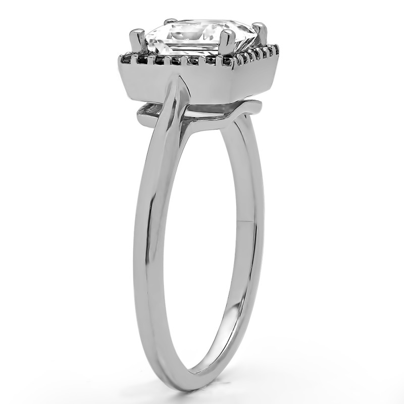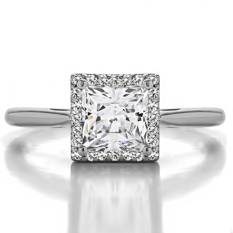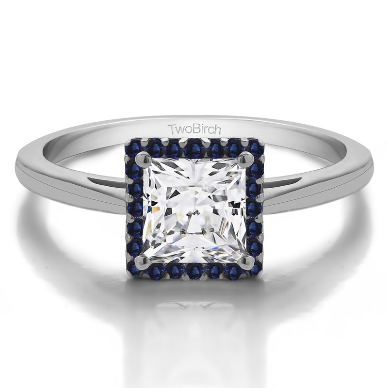 This engagement ring features a princess cut center moissanite, surrounded by 20 round sapphire side stones. It has a 0.9 carat center stone, and 0.1 carats of side stones, giving the engagement ring a total weight of 1 carat. The band measures about 2 millimeters wide. All stones in this engagement ring are brilliant moissanite with G to H color and VVS clarity. All TwoBirch engagement rings are made with conflict free and eco-conscious metals and stones.