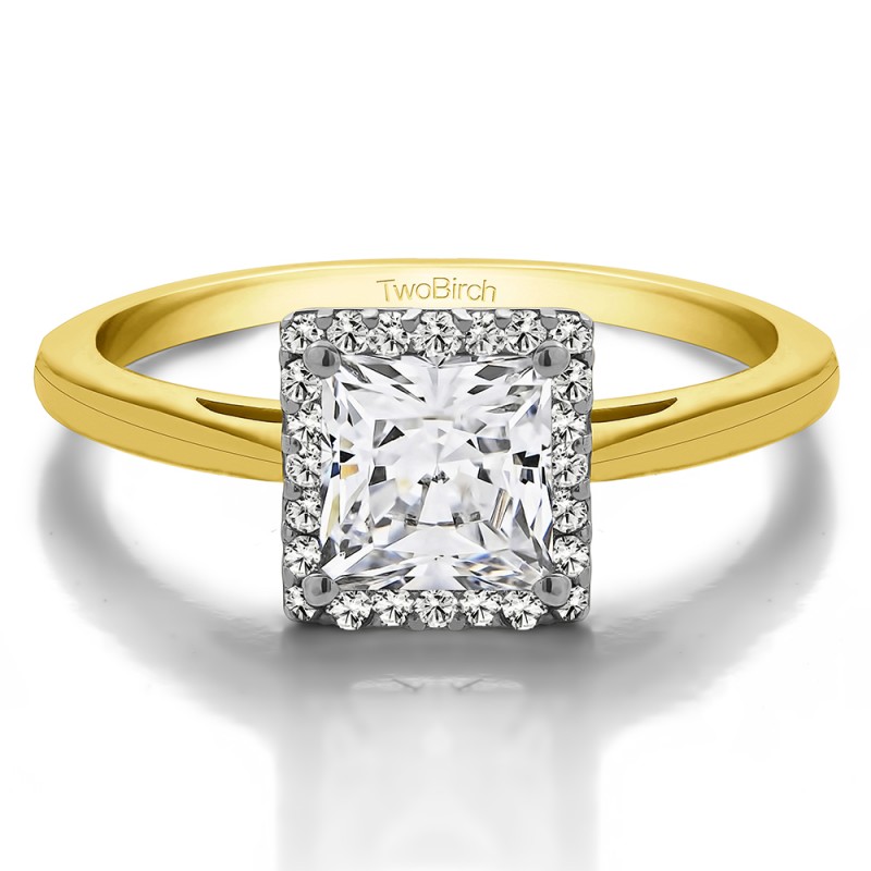 This engagement ring features a princess cut center moissanite, surrounded by 20 round moissanite side stones. It has a 0.9 carat center stone, and 0.1 carats of side stones, giving the engagement ring a total weight of 1 carat. The band measures about 2 millimeters wide. All stones in this engagement ring are brilliant moissanite with G to H color and VVS clarity. All TwoBirch engagement rings are made with conflict free and eco-conscious metals and stones.