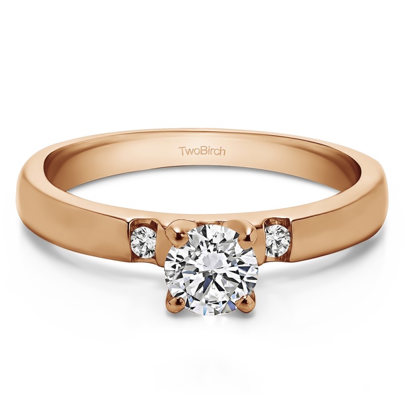 This engagement ring features a round center stone, surrounded by 2 round side stones. It has a 0.2 carat center stone, and 0.05 carats of side stones, giving the engagement ring a total weight of 0.25 carats. The band measures about 2 millimeters wide. All TwoBirch engagement rings are made with conflict free and eco-conscious metals and stones.