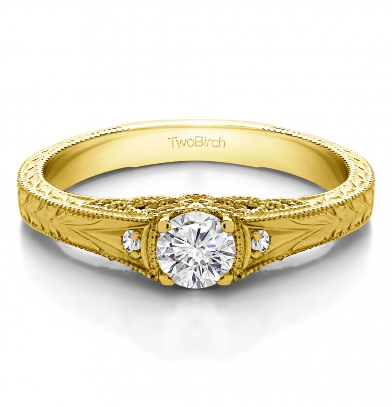 0.28 Ct. Vintage Three Stone Engagement Ring with Engraved Shank in Yellow Gold