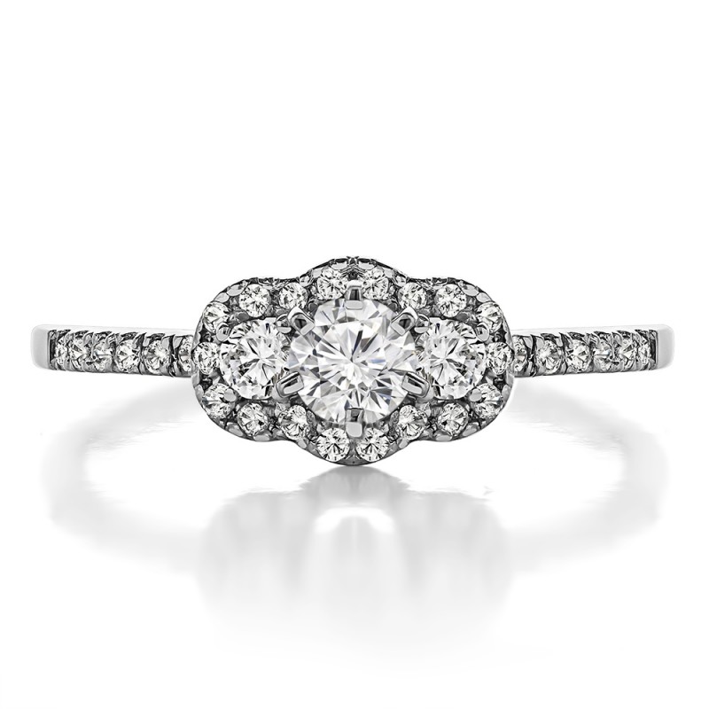 This engagement ring features a round center stone, surrounded by 32 round side stones. It has a 0.2 carat center stone, and 0.25 carats of side stones, giving the engagement ring a total weight of 0.45 carats. The band measures about 2 millimeters wide. All TwoBirch engagement rings are made with conflict free and eco-conscious metals and stones.