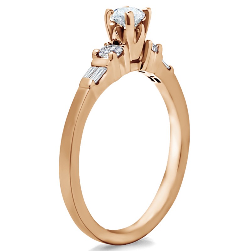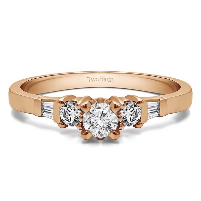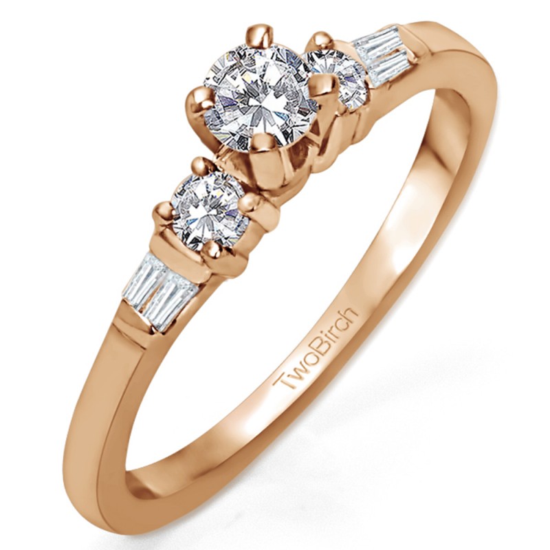 This engagement ring features an round center stone, surrounded by 6 round and baguette side stones. It has a 0.25 carat center stone, and 0.25 carats of side stones, giving the engagement ring a total weight of 0.5 carats. The band measures about 1.89 millimeters wide. All TwoBirch engagement rings are made with conflict free and eco-conscious metals and stones.