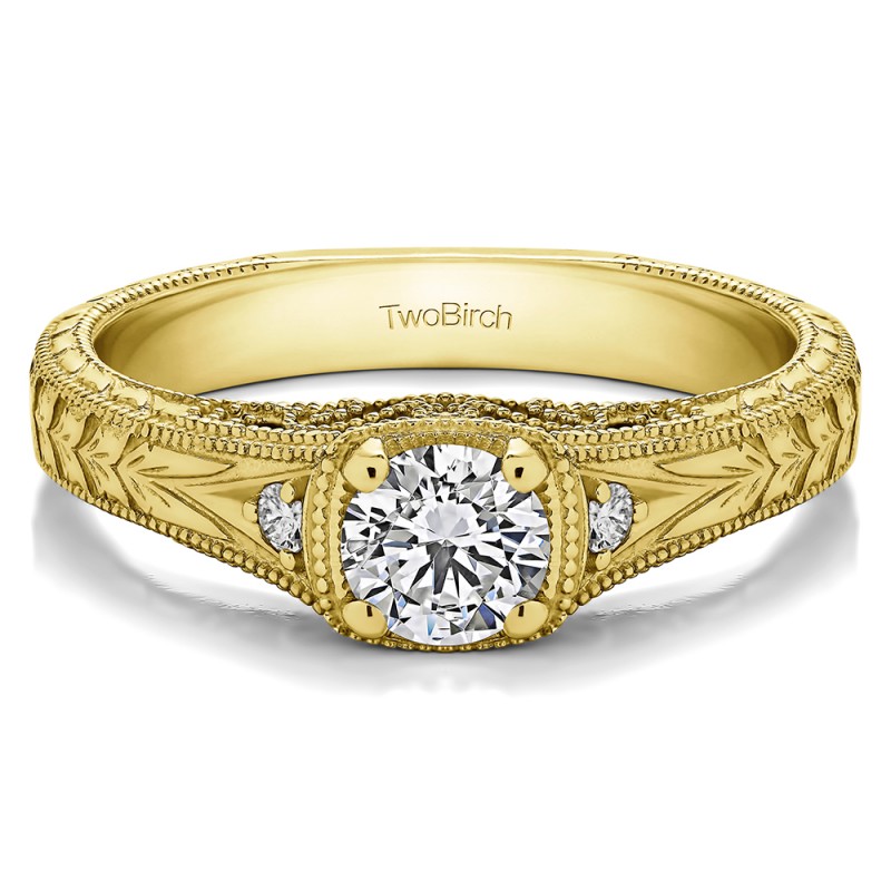0.54 Ct. Round Three Stone Vintage Engraved Engagement Ring in Yellow Gold