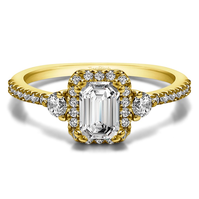 This engagement ring features an emerald center stone, surrounded by 34 round side stones. It has a 0.5 carat center stone, and 0.36 carats of side stones, giving the engagement ring a total weight of 0.86 carats. The band measures about 3 millimeters wide. All TwoBirch engagement rings are made with conflict free and eco-conscious metals and stones.