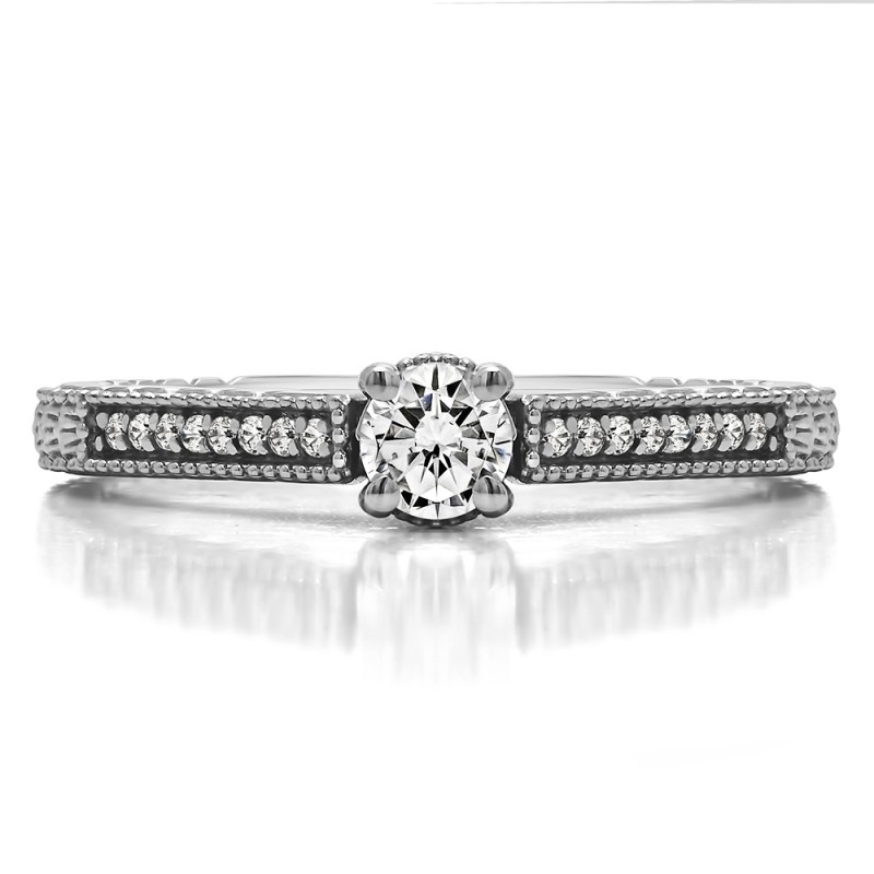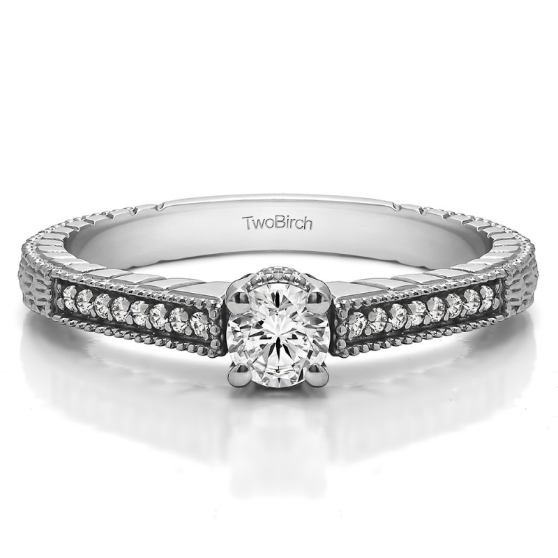 This engagement ring features a round center stone, surrounded by 16 round side stones. It has a 0.25 carat center stone, and 0.08 carats of side stones, giving the engagement ring a total weight of 0.33 carats. The band measures about 2.18 millimeters wide. All TwoBirch engagement rings are made with conflict free and eco-conscious metals and stones.