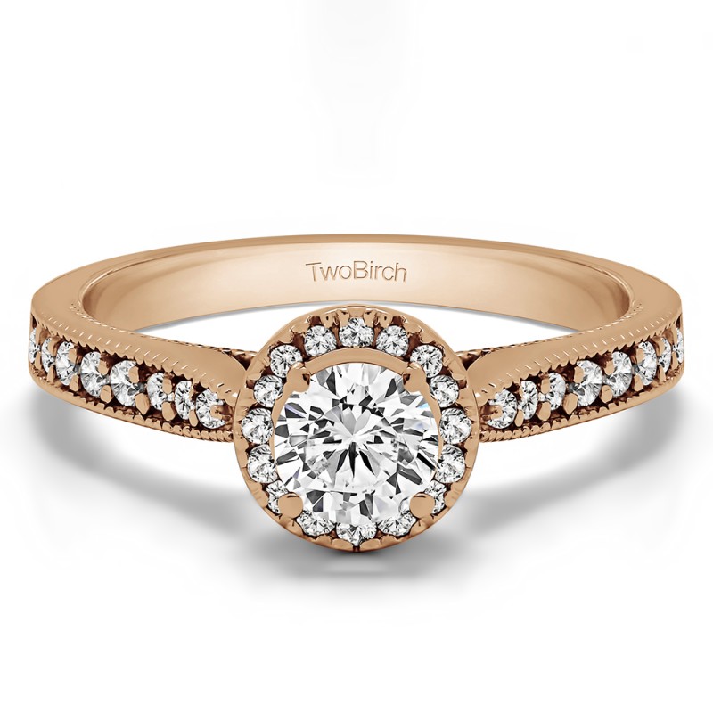 This engagement ring features a round center stone, surrounded by 31 round side stones. It has a 0.5 carat center stone, and 0.28 carats of side stones, giving the engagement ring a total weight of 0.78 carats. The band measures about 3 millimeters wide. All TwoBirch engagement rings are made with conflict free and eco-conscious metals and stones.