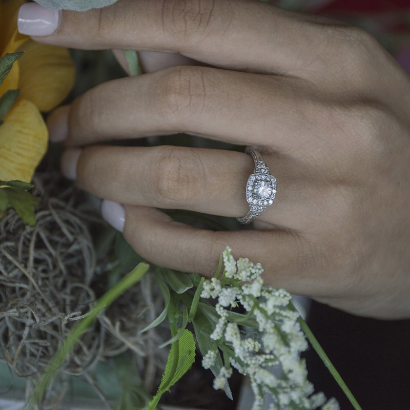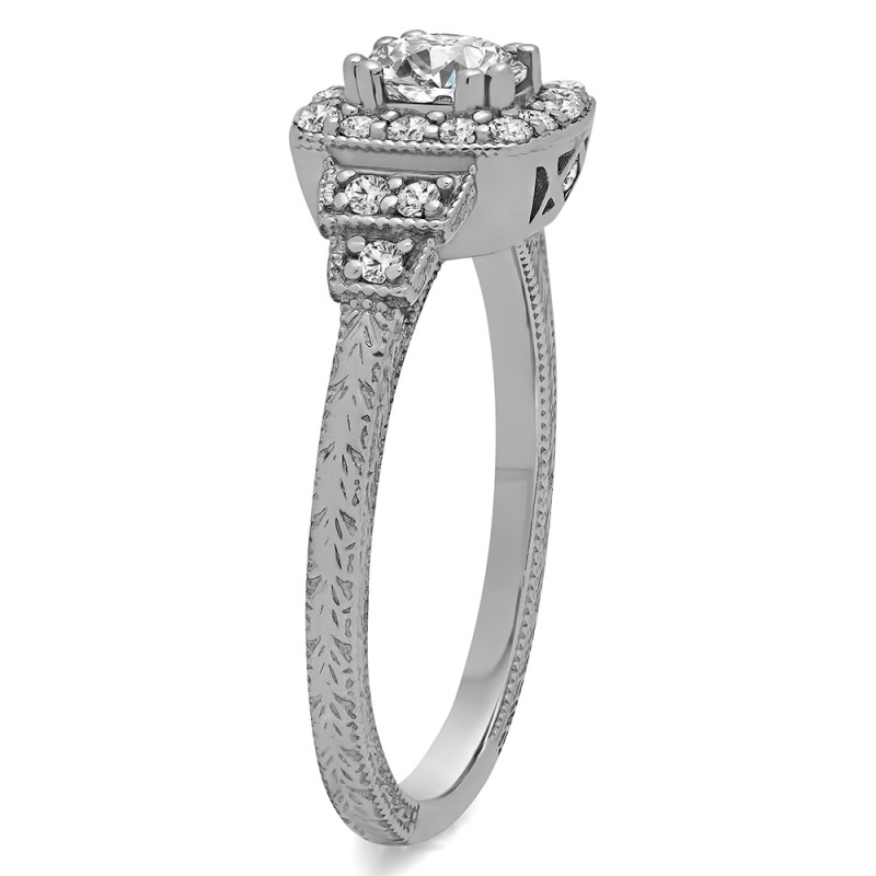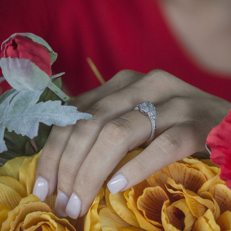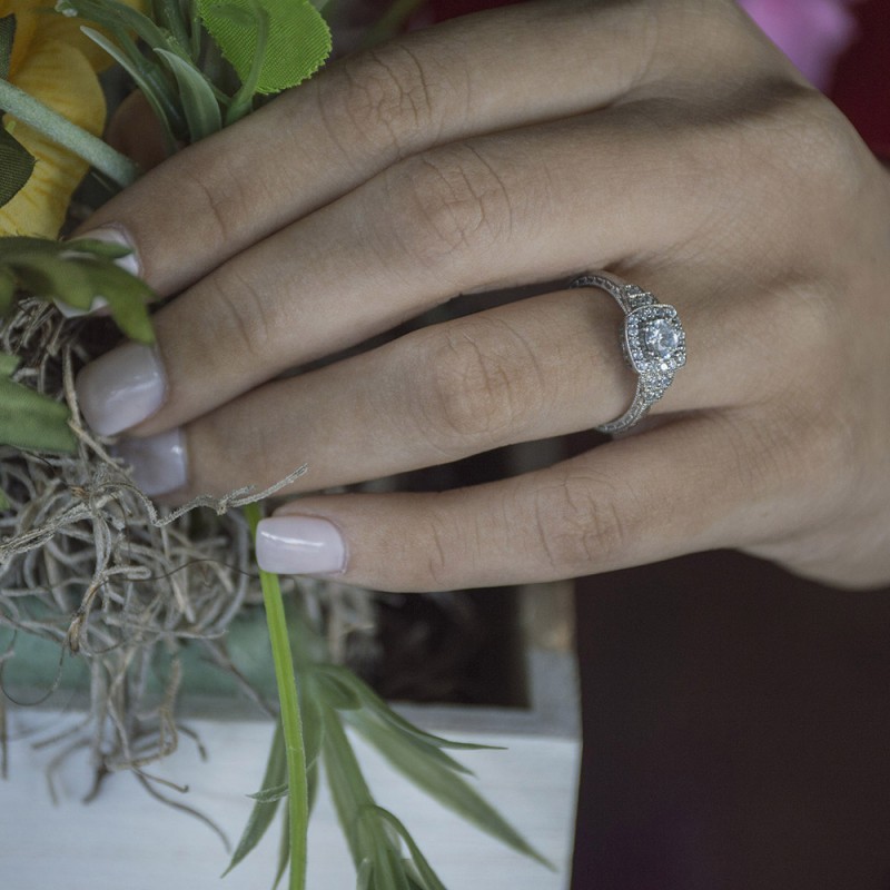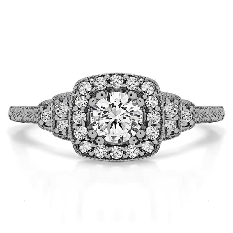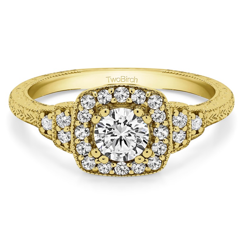 The vintage engagement ring features a round center stone, set with four prongs, and adorned with round stones in the halo. This vintage engagement ring features round stones with millgrained edges and engraved designs on the band. Each stone is handpicked by our team of gemologists to ensure the perfect engagement ring. Each center diamond is picked with the minimum specifications mentioned below. Please allow extra time for us to specially procure the center stone and produce this engagement ring for you. You will never regret your decision to purchase your TwoBirch Engagement Ring!