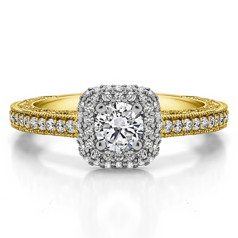 This engagement ring features a round center stone, surrounded by 72 round side stones. It has a 0.5 carat center stone, and 0.51 carats of side stones, giving the engagement ring a total weight of 1.01 carats. The band measures about 3 millimeters wide. All TwoBirch engagement rings are made with conflict free and eco-conscious metals and stones.