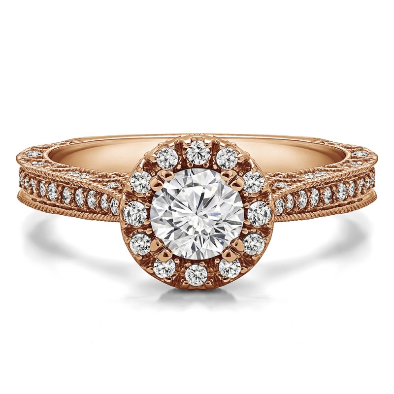 This engagement ring features a round center stone, surrounded by 96 round side stones. It has a 0.5 carat center stone, and 0.52 carats of side stones, giving the engagement ring a total weight of 1.02 carats. The band measures about 3 millimeters wide. All TwoBirch engagement rings are made with conflict free and eco-conscious metals and stones.