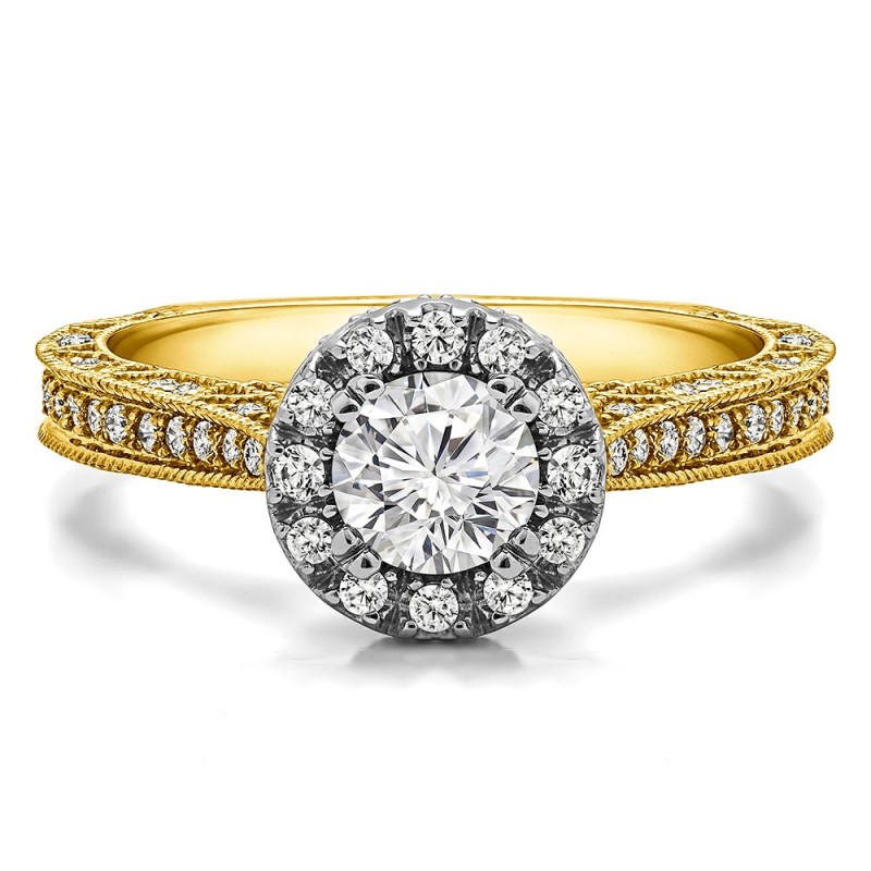 This engagement ring features a round center stone, surrounded by 96 round side stones. It has a 0.5 carat center stone, and 0.52 carats of side stones, giving the engagement ring a total weight of 1.02 carats. The band measures about 3 millimeters wide. All TwoBirch engagement rings are made with conflict free and eco-conscious metals and stones.