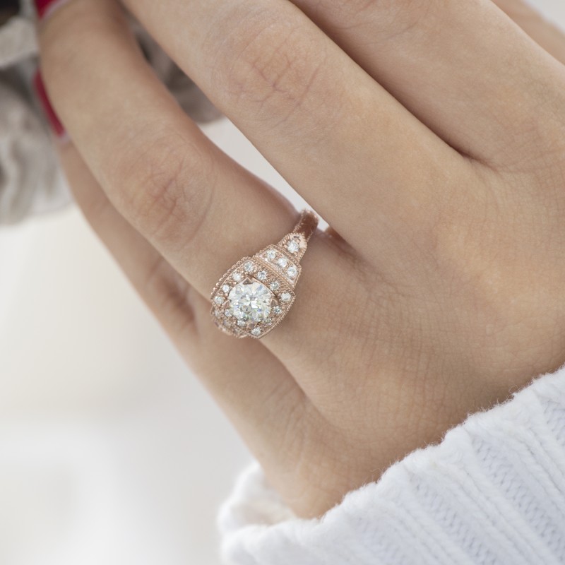 This engagement ring features a round center stone, surrounded by 20 round side stones. It has a 1 carat center stone, and 0.35 carats of side stones, giving the engagement ring a total weight of 1.35 carats. The band measures about 3 millimeters wide. All TwoBirch engagement rings are made with conflict free and eco-conscious metals and stones.