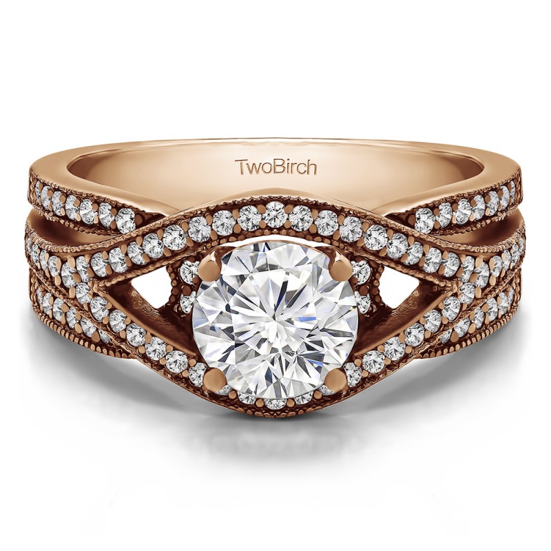 This engagement ring features a round center stone, surrounded by 82 round side stones. It has a 1 carat center stone, and 0.42 carats of side stones, giving the engagement ring a total weight of 1.42 carats. The band measures about 3 millimeters wide. All TwoBirch engagement rings are made with conflict free and eco-conscious metals and stones.