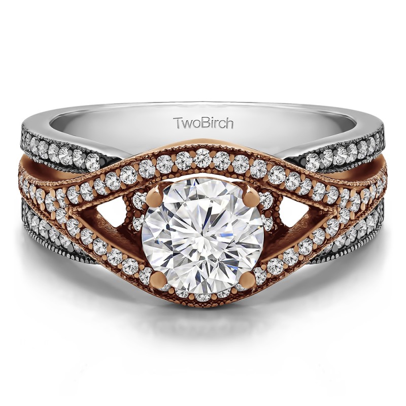 This engagement ring features a round center stone, surrounded by 82 round side stones. It has a 1 carat center stone, and 0.42 carats of side stones, giving the engagement ring a total weight of 1.42 carats. The band measures about 3 millimeters wide. All TwoBirch engagement rings are made with conflict free and eco-conscious metals and stones.