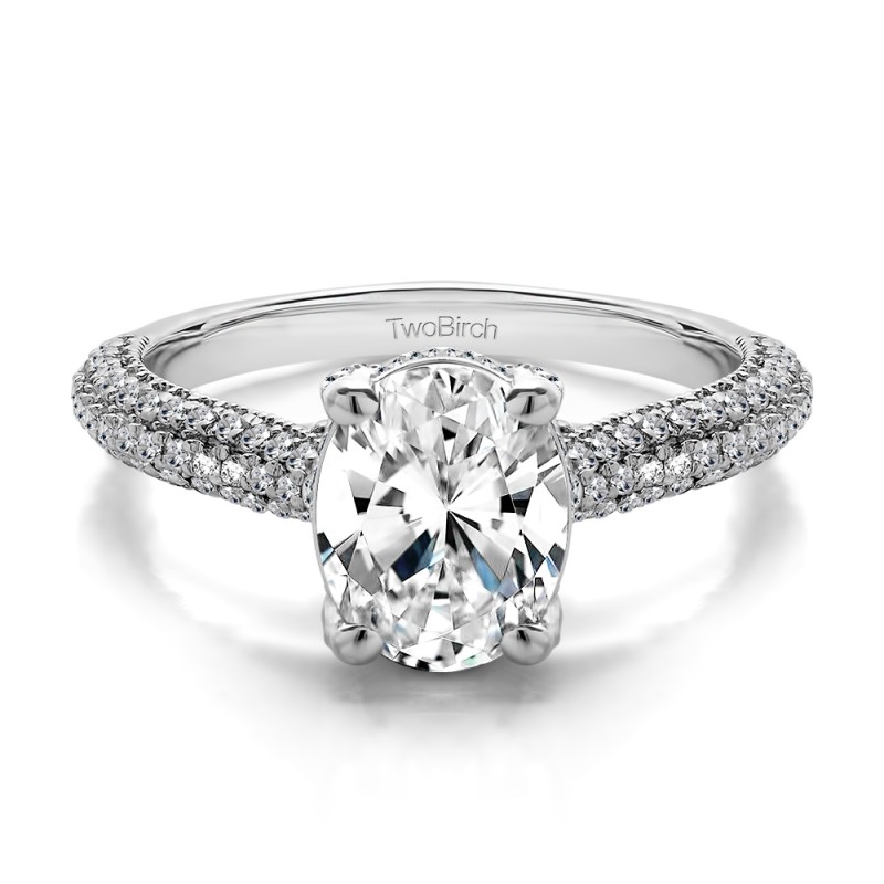 This engagement ring features an oval center stone, surrounded by 102 round side stones. It has a 1.25 carat center stone, and 0.41 carats of side stones, giving the engagement ring a total weight of 1.66 carats. The band measures about 3 millimeters wide. All TwoBirch engagement rings are made with conflict free and eco-conscious metals and stones.