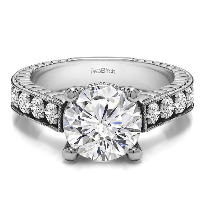 This engagement ring features a round center stone, surrounded by 10 round side stones. It has a 3 carat center stone, and 0.7 carats of side stones, giving the engagement ring a total weight of 3.7 carats. The band measures about 2 millimeters wide. All TwoBirch engagement rings are made with conflict free and eco-conscious metals and stones.