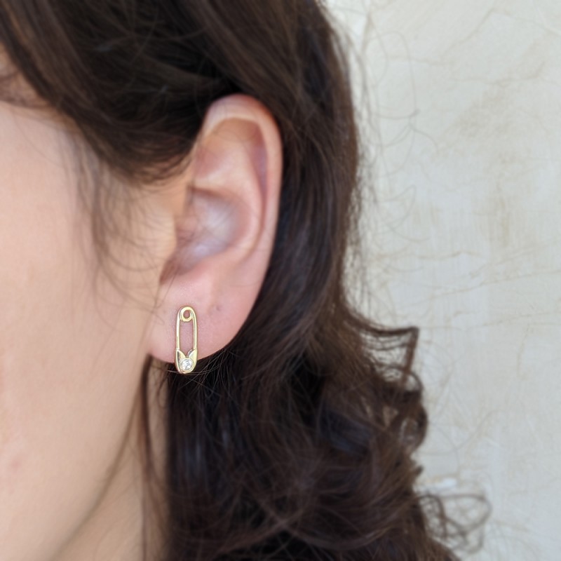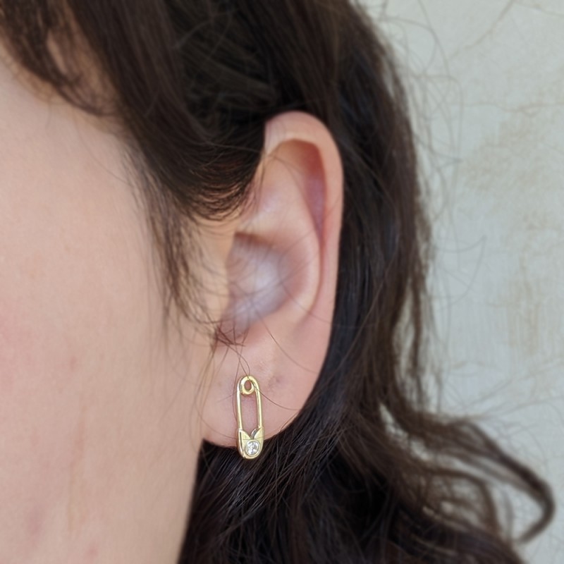 Stunning 18k yellow gold microplated sterling silver safety pin shaped earrings featuring posts and tension backs. The earrings measure about 1/2 inch in length and 1/8 of an inch in width. Small and simple cute earrings make the perfect gift! These safety pin earring add a subtle accessory that you can wear for everyday fun and fashion. _ PREMIUM QUALITY_ The earrings are made with premium Cubic Zirconia, 925 Sterling Silver posts and 18K gold micro plating giving lasting brilliance and a hypoallergenic finish. _ MADE WITH CARE _ TwoBirch jewelry makes a sentimental surprise and a great gift for birthdays, anniversaries, Mother's Day or wedding celebration, or a great self purchase! _ 1 year FREE Warranty _ To ensure your complete satisfaction, we offer a free 1 year warranty. All our metals are lead-free, nickel-free and hypoallergenic. Excellent customer service.