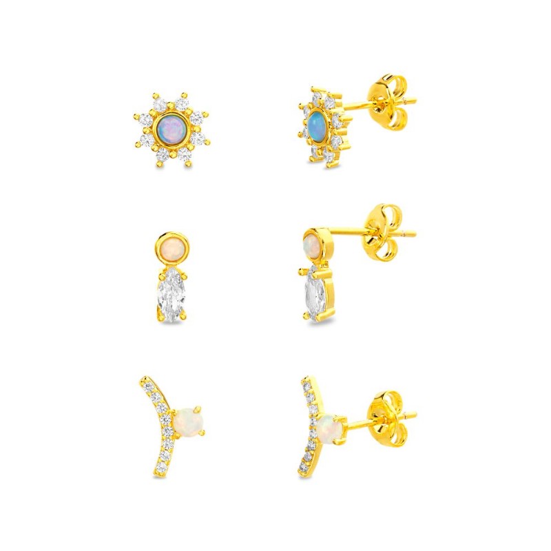 | Key Product Features | TwoBirch 18k Yellow Gold over Sterling Silver Cubic Zirconia Earring Trio Set (Three Pairs of Earrings) Opal Halo Studs Marquise and Bezel Opal Earrings Opal Curved Bar Earrings Three pairs of earrings all featurs POST & TENSION BACKS |