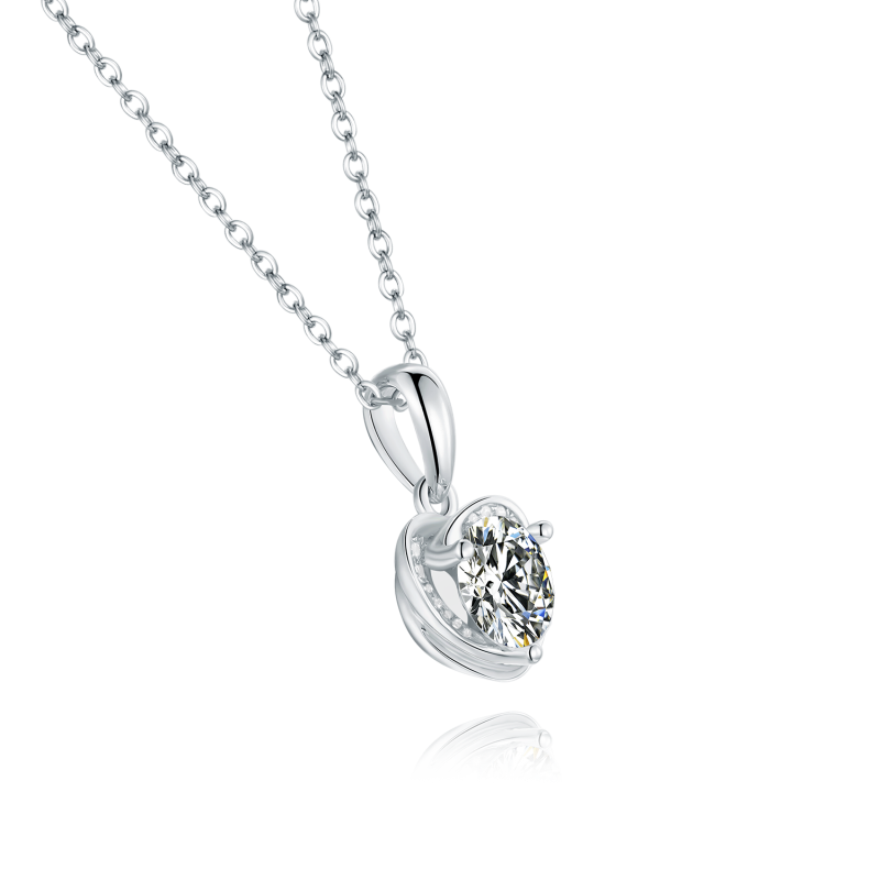 Key Product Features The pendant features one 6.5 mm round moissanite which is a 1 carat diamond equivalent weight. The pendant is set in a 6 prong setting and sits on a 925 sterling silver platinum plated cable chain which is made in Italy. The chain is 18 inches long