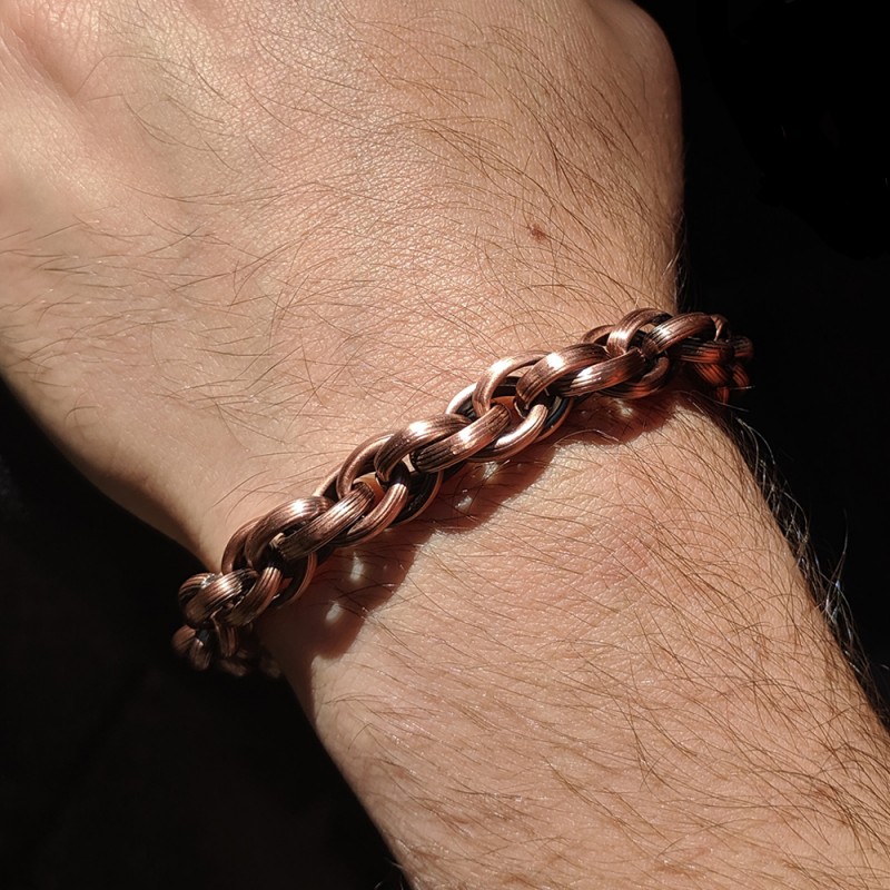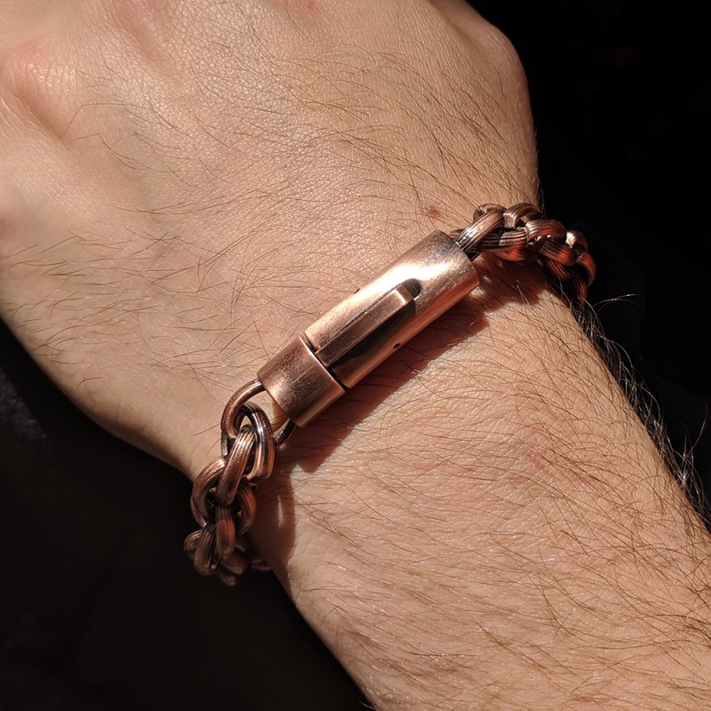 This bracelet features a stunning 18k rose gold color over stainless steel. The finish is durable and long lasting. The bracelet measures about 9 mm wide, 8.5 inches long with a magnetic slide in clasp for added security.