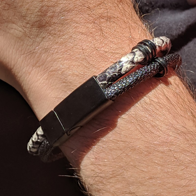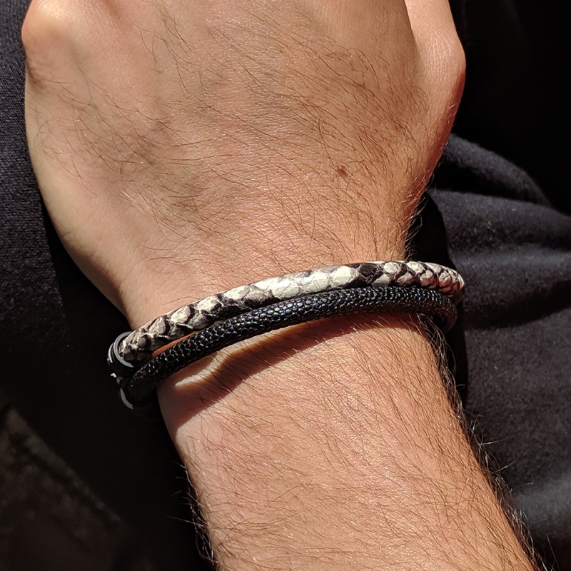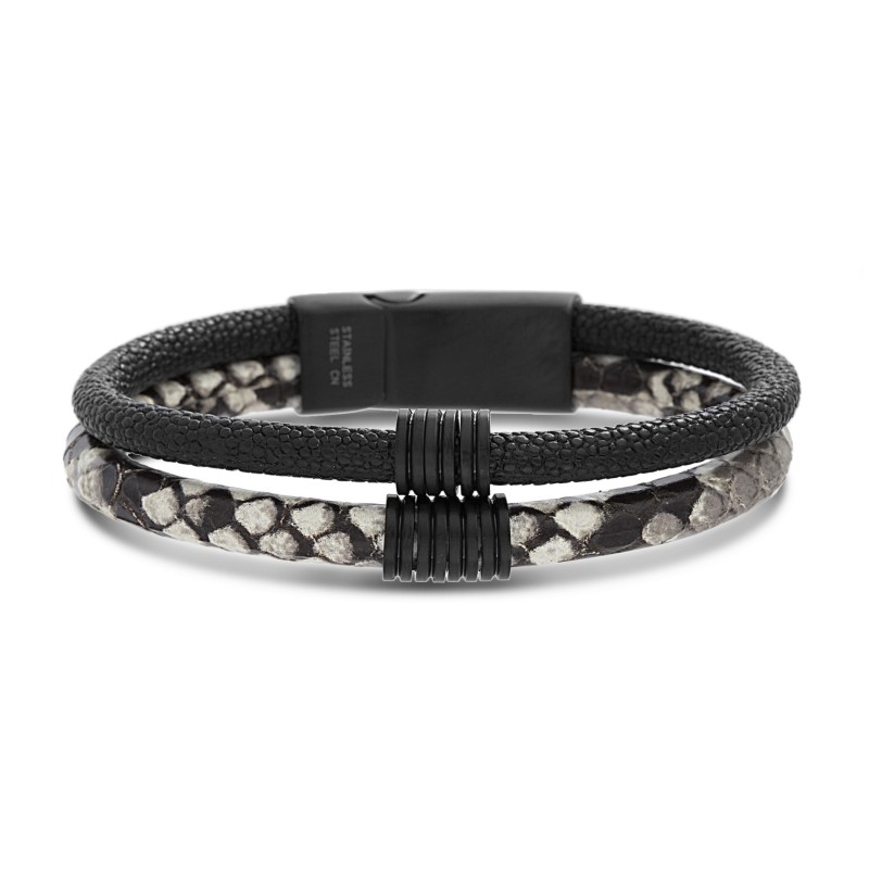 | Key Product Features | This bracelet features one black and white faux snake leather bracelet and one faux black snake leather bracelet with a magnetic sliding clasp. |