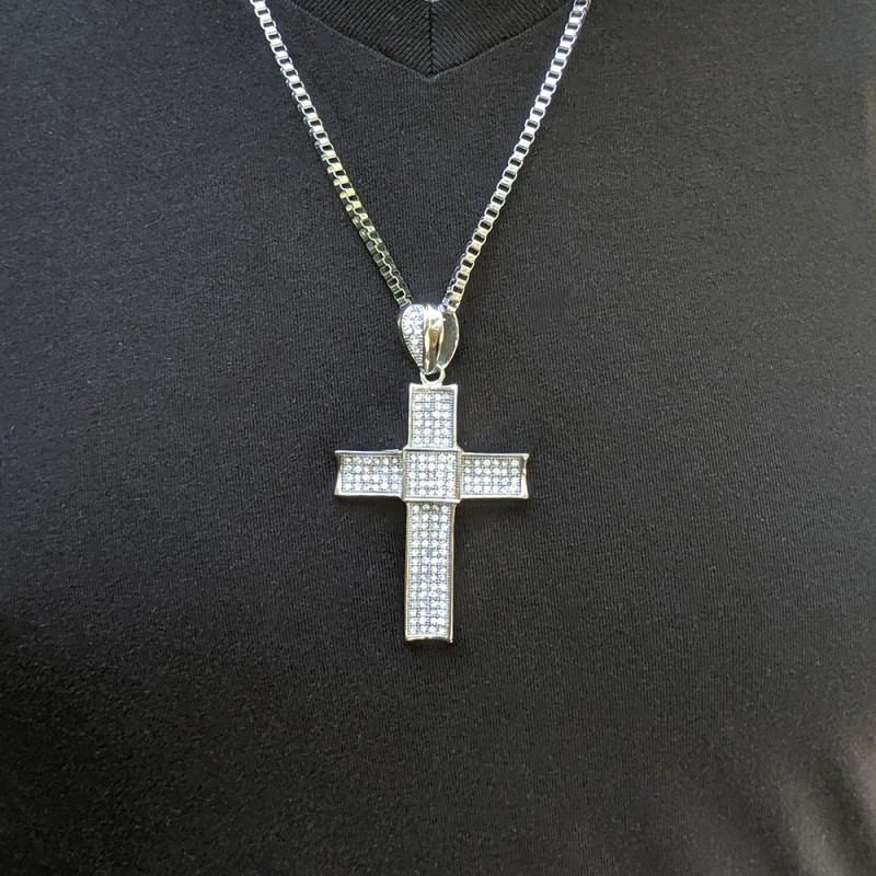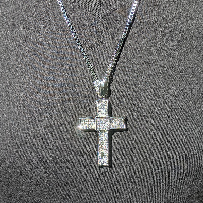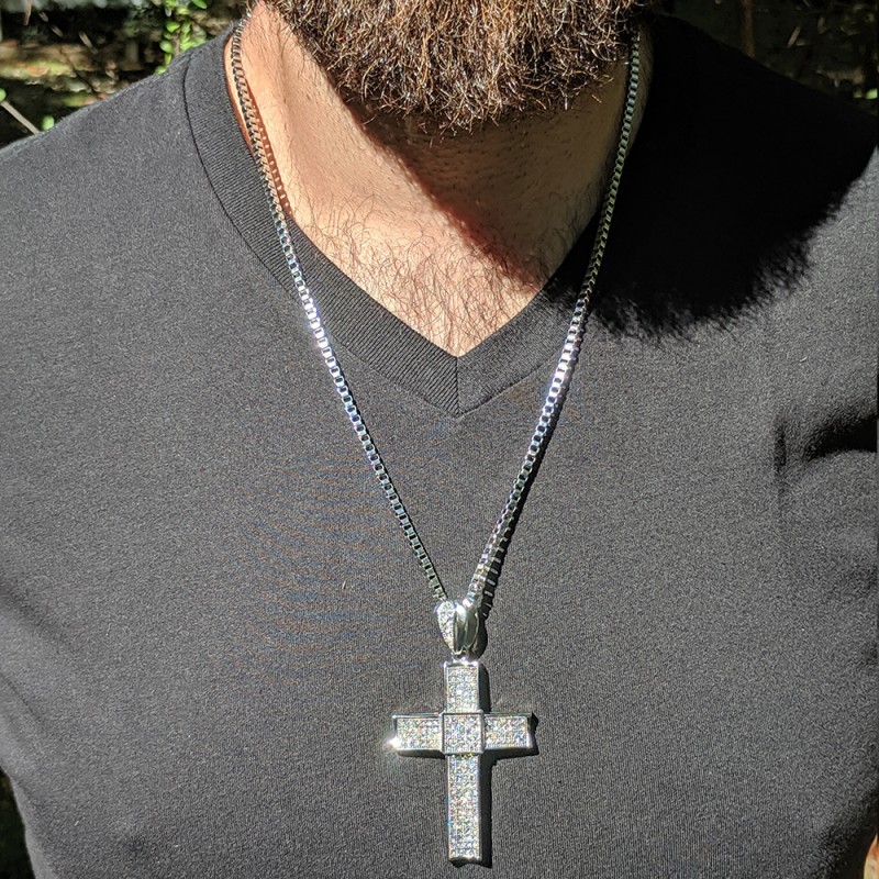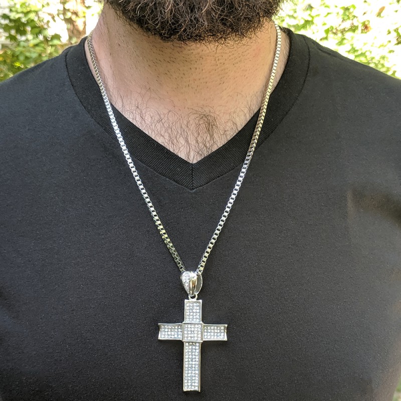 Mens Womens Large Steel Cross Pendant Necklace with Sparkly Stones on 24 Inch Box Chain. This men's stainless steel men's cross measures about 2.25 x 1.75 inches (approximately) not including the bail. The bail measures about .5 x .75 inches. The chain is a 24 inch box chain with a lobster clasp.