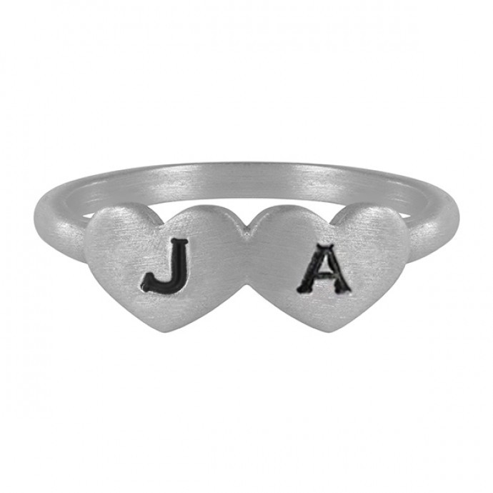 This TwoBirch hand stamped double heart shaped initial ring can be customized to fit any two upper case letters. This ring can symbolize two hearts coming together, your own initials, children's initials, or anything important to you. This custom initial ring comes in sterling silver, rose plated sterling silver, yellow plated sterling silver, 10k white gold, 10k rose gold, 10k yellow gold, 14k white gold, 14k rose gold and 14k yellow gold. This stunning name ring is made in sizes 4 to 15 in 1/2 size intervals. You can personalize this ring with the letter of your choice, and metal type you would like. Every initial ring created by TwoBirch is handcrafted just for you in the metal type, letters, and finger size you select.