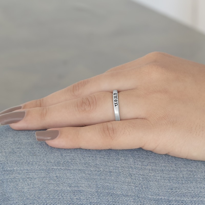 This TwoBirch stamped ring can be customized to fit up to 5 letters. You can have your name stamped on the ring, or have a mantra that represents you put on this ring. This personalized name ring comes in sterling silver, rose plated sterling silver, yellow plated sterling silver, 10k white gold, 10k rose gold, 10k yellow gold, 14k white gold, 14k rose gold and 14k yellow gold. This stunning name ring is made in sizes 4 to 15 in 1/2 size intervals. You can personalize this ring with the letters of your choice, and metal type you would like. Every name ring created by TwoBirch is handcrafted just for you in the metal type, letters, and finger size you select.
