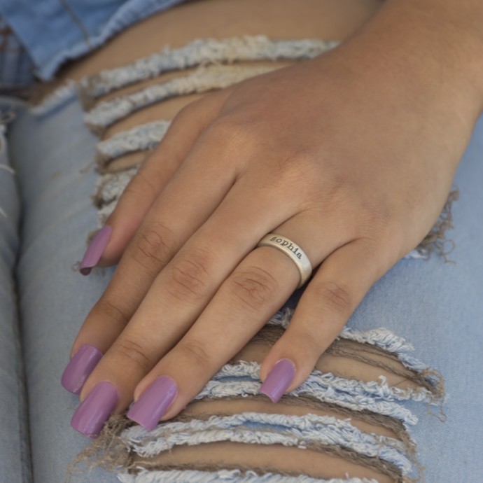 This TwoBirch stamped ring can be customized to fit up to 9 Letters. You can have your name stamped on the ring, or have a mantra that represents you put on this ring. This personalized name ring comes in sterling silver, rose plated sterling silver, yellow plated sterling silver, 10k white gold, 10k rose gold, 10k yellow gold, 14k white gold, 14k rose gold and 14k yellow gold. This stunning name ring is made in sizes 4 to 15 in 1/2 size intervals. You can personalize this ring with the letters of your choice, and metal type you would like. Every name ring created by TwoBirch is handcrafted just for you in the metal type, letters, and finger size you select.