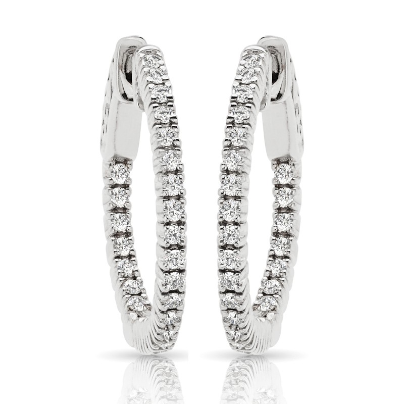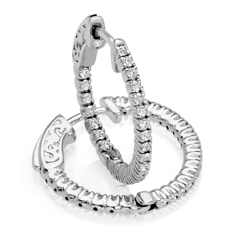 These inside out hoop earrings features 50 round brilliant moissanites, set in shared prongs. The moissanites are set both on the inside and the outside portions of the hoops. They measure approximately 3/4 inch in diameter.