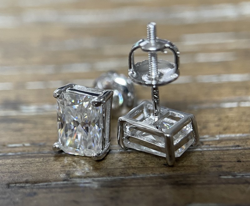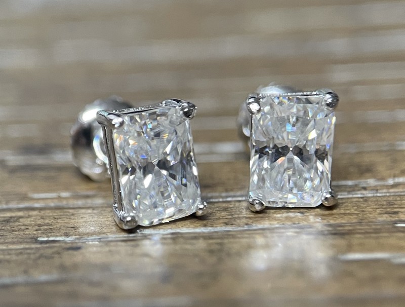 These TwoBirch radiant brilliant cut moissanite studs are set in 18k white gold plated sterling silver. They feature screw backs and posts making them very secure. Each moissanite measures 5 x 7 mm which gives it a diamond equivalent weight of 2 carats. The stones are D to E in color and VVS in clarity. They feature a certificate by GRA.