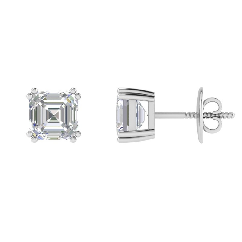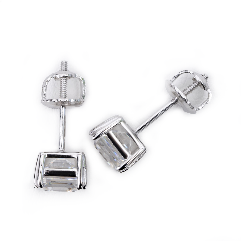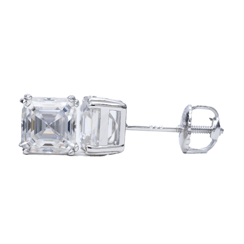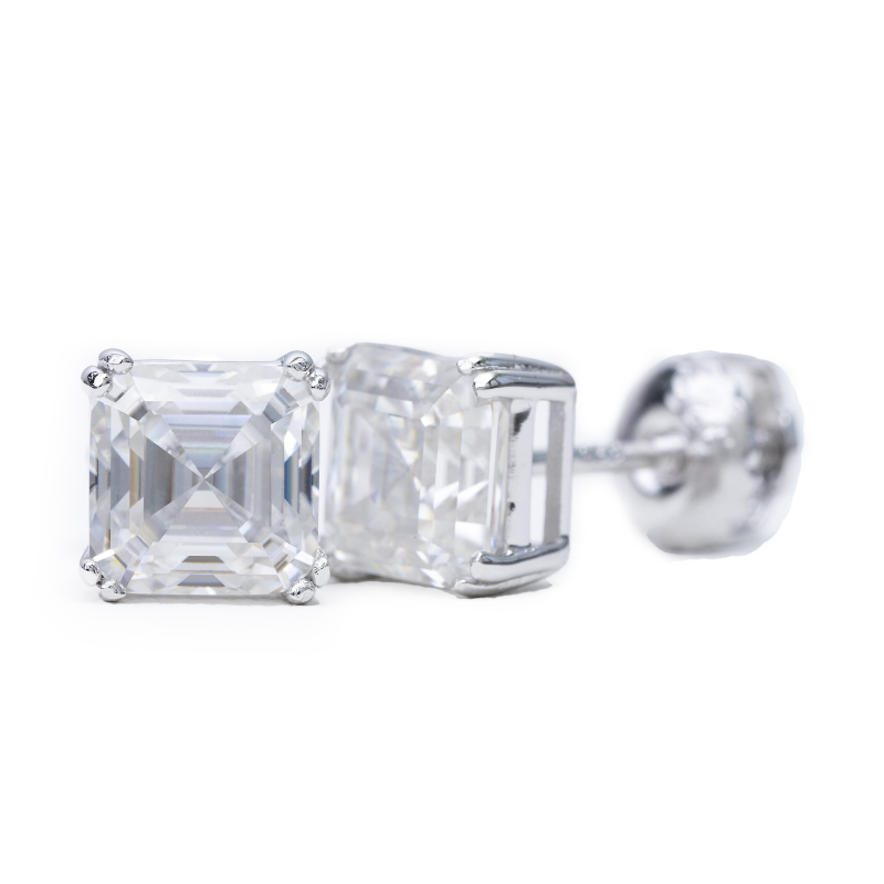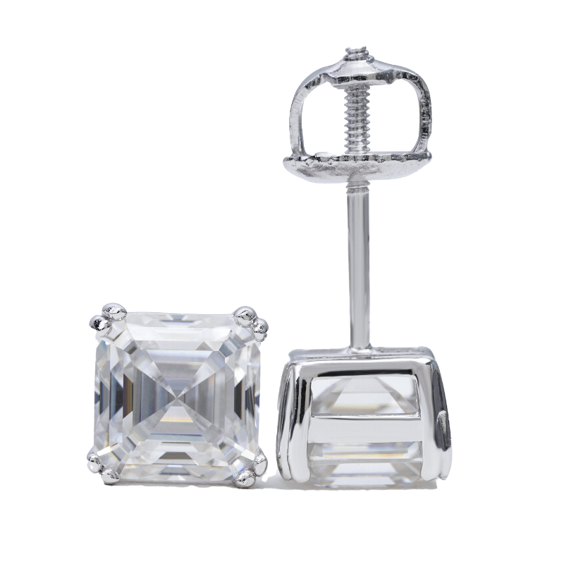 | Key Product Features | These TwoBirch Asscher moissanite studs are set in 18k white gold plated sterling silver. |