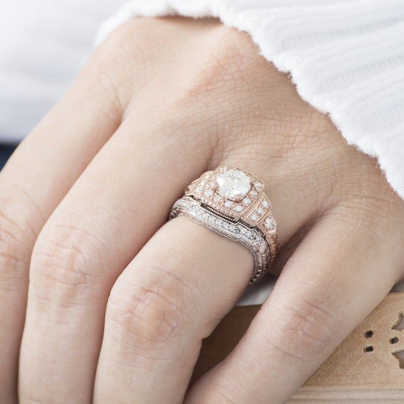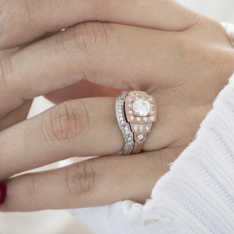 This wedding ring is made to match with the engagement ring below. If you already have an engagement ring, you can add PerfectFit onto your order. We will send you images of your engagment ring with our matching band. You can consider it a virtual ring fitting.