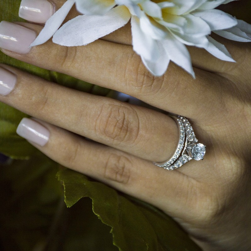 This wedding ring is made to match with the engagement ring below. If you already have an engagement ring, you can add PerfectFit onto your order. We will send you images of your engagment ring with our matching band. You can consider it a virtual ring fitting.