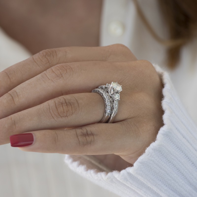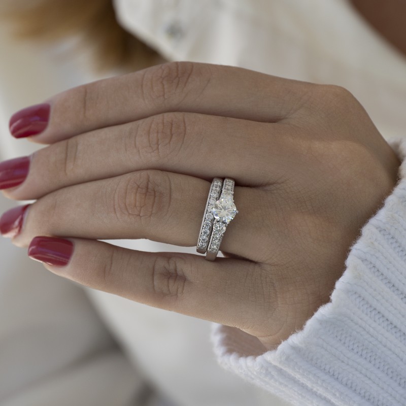 This wedding ring is made to match with the engagement ring below. If you already have an engagement ring, you can add PerfectFit onto your order. We will send you images of your engagment ring with our matching band. You can consider it a virtual ring fitting.