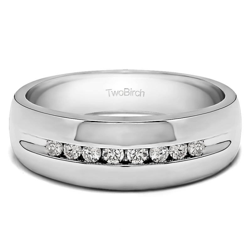 This men's ring features 8 white round channel set stones. The band measures 5.5mm in total width. The total combined carat weight is 0.32 carats. This listing features moissanite, cubic zirconia or natural diamonds. This men's ring weighs 12.73 grams and features a comfort fit band. This ring features a thing channel, with open ends, and a stunning high polish finish.