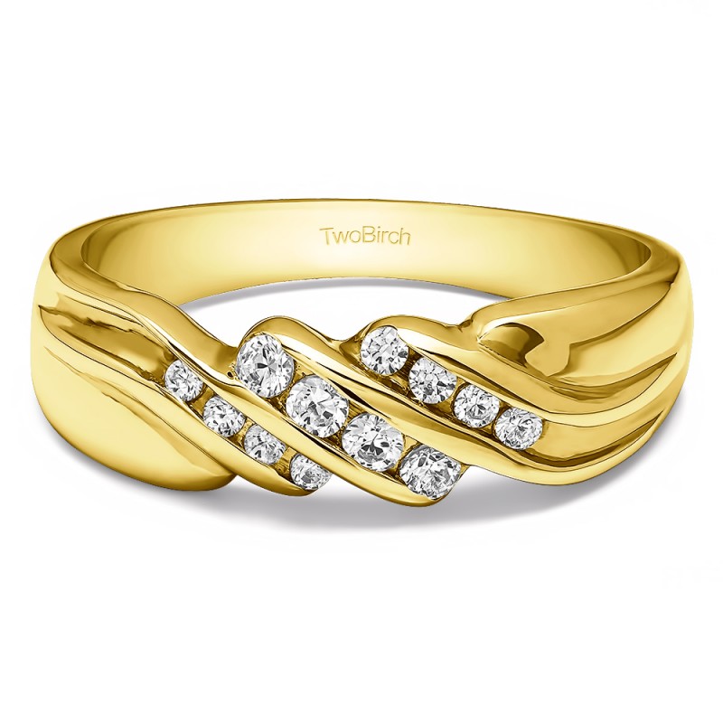 This men's ring features 12 white round channel set stones. The band measures 5.5mm in total width. The total combined carat weight is 0.32 carats. This listing features moissanite, cubic zirconia or natural diamonds. This men's ring weighs 15.5 grams and features a comfort fit band. This men's ring has three channels with a twisted shank design.